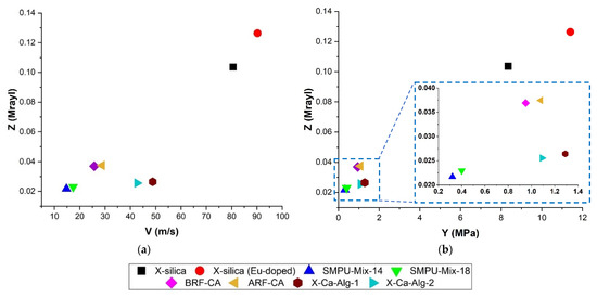 Figure 4 shows the relationship between Z vs. v (Figure 4a) and Z vs. Y (Figure 4b) for the different types of aerogels studied here. In both cases, a positive slope can be seen. Speed of propagation is highest in aerogels with the greatest Z values (X-silica-La2O2S:Eu 0.126 Mrayl, and X-silica 0.104 Mrayl) (Figure 4a). The speed of propagation drops significantly for aerogels with lower Z values, with a noticeable reduction between the silica-based aerogels (102.9 m/s and 84.26 m/s, respectively) and the alginate-based aerogels with v values in the range of 101.41 m/s and 121.77 m/s. As a first approximation, Equation (2a)—Table 2, suggests a linear relationship between Z and v for homogenous materials. While results presented in Figure 4a deviate slightly from a linear behavior, the overall trend is consistent with theoretical expectations [40]. A linear trend with a positive slope can be seen in Figure 4b where Z increases with Y.