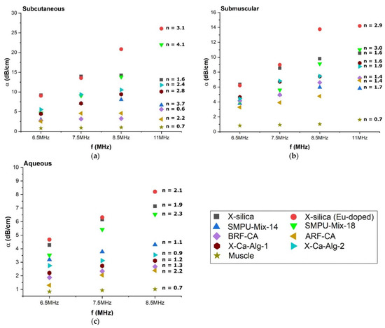 The degree of attenuation was dependent on the scan frequency and confirms the theoretical understanding that is suggested by Equation (3b), Table 2. The attenuation coefficient, α, was calculated for each aerogel type, in three different environments (SC, SM, and Aq) and at frequencies; 6.5, 7.5, 8.5, and 11 MHz summarized in Figure 5. From Equation (3b), Table 2, we can also see that the attenuation is dependent upon the nth power of the frequency. Power law fitting of α vs. f was conducted for each measurement and the value of n was calculated for each aerogel type, at each frequency (indicated on the graphs in Figure 5a–c). The n value for muscle that we arrived at using this method was n = 0.7 and closely matched previously reported values [41] indicating that the method adopted here for extracting n values is indeed correct.