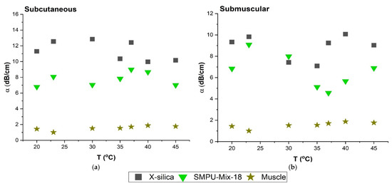 Comparison of attenuation coefficient (α) at temperature range of 20–45 °C at 6.5 MHz. (a) α in SC region (b) α in SM region. Temperature range is consistent with small fluctuations.