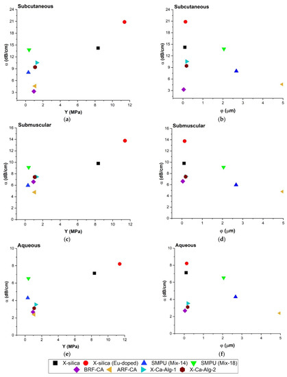Figure 7b,d,f show a decrease in α with an increase in φ. Doped X-silica, X-Ca-Alg-1, SMPU-Mix-14 and ARF-CA have a larger difference in the pore diameter compared with each other and show a decrease in attenuation which is in agreement with Equation (5a,b), Table 2 where α is inversely proportional to φ2. Figure 7a,c,d show the direct relationship between α and Y. In the range of 0–2 MPa, a greater degree of scattering α was observed when compared to Y > 2 MPa behavior.