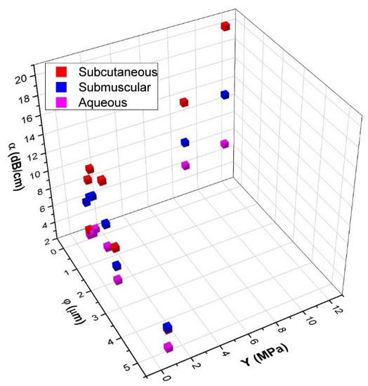To better understand the relationship between α, Y, and φ, a 3D scatter plot was created from data presented in Figure 7 and is shown in Figure 8. The influence of φ and Y on α can be observed with two clear patterns. With samples of Y below 2 MPa, the influence of φ on α is greater than Y, where α decreases with increasing φ. For samples with φ below 0.5 µm, Y has a higher influence where an increase in Y corresponds to an increase of α.