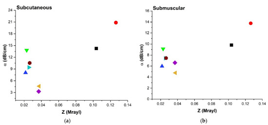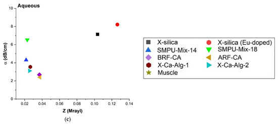 Comparison of attenuation coefficient (α) at 8.5 MHz and acoustic impedance (Z) for all three configurations; (a) SC, (b) SM, and (c) Aq environment.