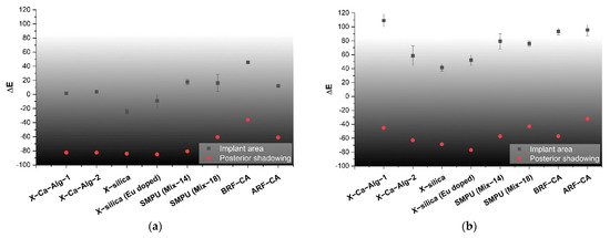 The quantification of pixel intensity of US images taken at 8.5 MHz was performed for two distinct image areas; (1) implant and (2) the posterior shadowing region and applying Equation (4), Table 2. These regions correspond to ROI 1 and 3 of Figure 3 for implant area and, ROI 2 and 4 for posterior shadowing. By evaluating these two regions (described in Section 2.6) for each US image we were able to calculate the echogenicity of the different types of aerogels. Results indicate a strong dependency of Echogenicity on implant location (SC vs. SM). Figure 10a shows the echogenicity (ΔE) of the aerogels in the SC region while Figure 10b presents the data for the SM region. In the SC case, X-silica is most hypoechoic (ΔE = −24%), while BRF-CA is most hyperechoic (ΔE = +50%). In the SM case, X-silica is the least hyperechoic aerogel (ΔE = +40%) and X-Ca-Alg-1 is the most hyperechoic with a ΔE value of +120%. All the aerogels in the SM region show hyperechogenicity with X-Ca-Alg-1 (109%) being the highest and X-silica (42%) being the least (Figure 10b). By comparing Figure 10a and Figure 10b, it can be seen that the overall echogenicity has increased in the SM region which will enhance the contrast and better identify the aerogel implant. Error bars associated with the Posterior Shadowing were statistically insignificant and hence not shown.