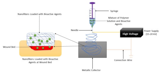 - Ambekar, R.S.; Kandasubramanian, B. Advancements in nano fibers for wound dressing: A review. Eur. Polym. J. 2019, 117, 304–336. [Google Scholar] [CrossRef]