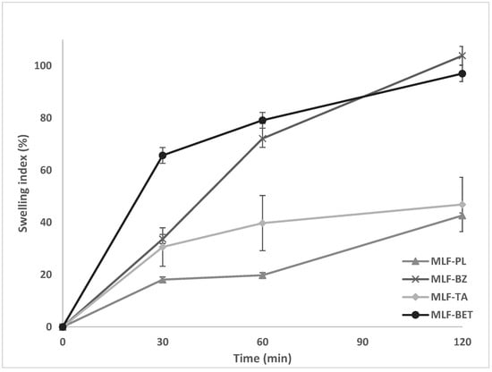 Figure 1). The lowest values were demonstrated in the drug-free samples (MLF-PL) starting from 18% in the 30th minute of the test and reaching only 42% after the second hour of the study. Incorporation of the model drugs in the polymer films substantially increased the swelling capacity of the samples. The highest swelling index was determined in the films containing BZ and BET (103.85% and 97.01%, respectively). Such values for the swelling index could be considered relevant to buccal drug delivery systems due to the lower risk of excessive polymer erosion yet allowing high drug diffusion rate. The higher swelling index of the drug loaded samples in comparison to the drug-free model could be attributed to the presence of BZ and BET in the finishing chitosan layer. Since these two drugs are freely soluble in aqueous media, they diffuse into the testing fluid (simulated saliva solution) leading to the formation of multiple channels and pores in the chitosan layer. The polymer chains are allowed to hydrate freely, followed by a substantial water uptake. Our hypothesis was confirmed by the swelling profile of MLF-TA. Tolfenamic acid, which is incorporated in the casein layer, being practically insoluble in aqueous media at the experimental pH (6.75), diffuses slowly through the polyelectrolyte network, preventing the formation of voids in the polymer layers for water penetration.