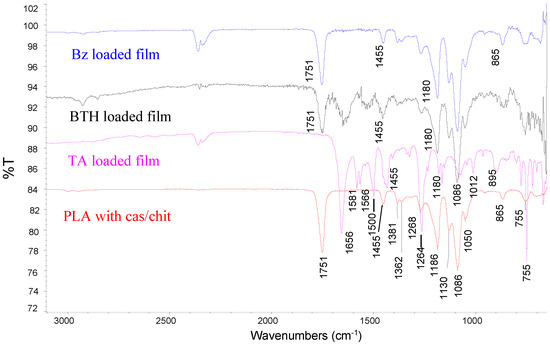 −1 correspond to C=O and C-O stretching of an ester group (PLA). Amide I and amide II bands, characteristic for casein, appear in the region 1680–1500 cm