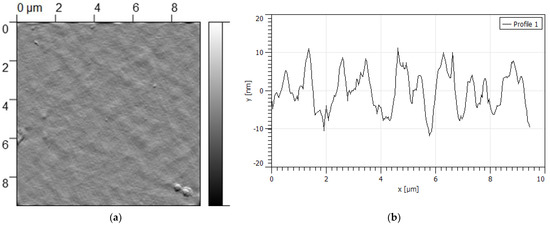 The surface morphology of the polyelectrolyte multilayer films was investigated by atomic force microscopy in tapping mode. The experiments were done by Nanosurf flex AFM (Nanosurf, Liestal, Switzerland), equipped with standard cantilevers Tap190Al-G The tip radius was 10 nm. The area of the images was 10 × 10 µm