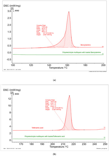 Table 3. No peaks were observed for the drugs loaded in polyelectrolyte multilayers. Hence, it might be assumed that the entrapment of the drugs in the polyelectrolyte matrix change their phase from crystal to amorphous. The received experimental data are in good agreement with the literature [