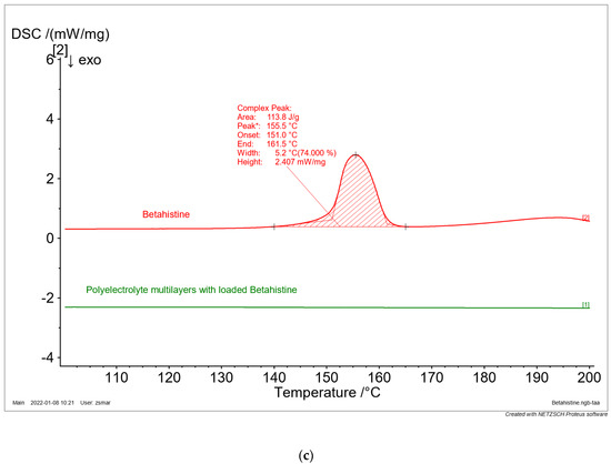 The phase state of the drugs (crystal or amorphous) is one of the most important physical parameters, which influence their bioavailability. The thermal behavior of drug-free and BZ, TA, and BET-loaded samples were examined by the method of DSC. The thermograms of the pure drugs (
