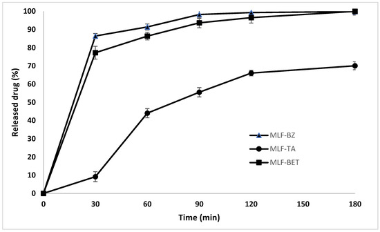 Figure 7). The release patterns of BZ and BET are biphasic, with a clearly defined initial phase characterized by an extensive burst effect within the first 30 min. In the second phase there is a delay, and the release rate is lower. The rapid drug release from MLF-BZ and MLF-BET may be due to faster swelling of the polymer network, resulting in more void space. Indeed, the drug release profiles resemble greatly the swelling study patterns, suggesting the strong dependence of drug release on the swelling behavior of polymer delivery systems. This assumption is supported by the release profile of MLF-TA. In addition to the poor TA solubility, MLF-TA samples are less swellable, and achieve prolonged but incomplete drug release (70.08%).