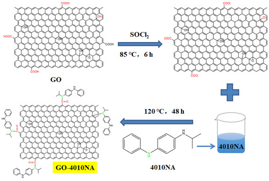 The steps for the synthesis of anti-migration antioxidants are shown in Figure 1. First, 1 g GO was weighed and dissolved in 150 mL sulfoxide chloride (SOCl2). The reaction was performed at room temperature for 1 h under ultrasound, and then at 85 °C for 6 h, after which SOCl2 was removed by rotary steaming. Then it was added to 100 mL DMF for an ultrasound for 1 h, 5 g 4010NA was dissolved in 200 mL DMF and added to GO solution for reflux reaction at 120 °C for 48 h. Then the reaction solution was pumped and filtered, the solid product was poured into anhydrous ethanol for soaking for 12 h. During the extraction and filtration process, anhydrous ethanol was used for washing 4–6 times. Finally, the solid product was dried in a 40 °C vacuum oven for 12 h to obtain GO-4010NA.