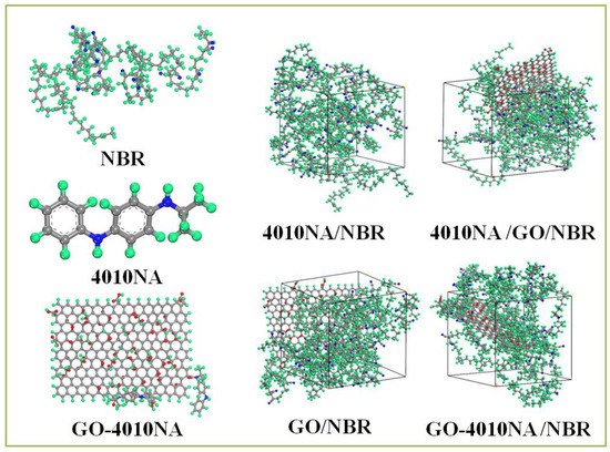 NBR is a polar rubber, because the molecular chain contains polar group nitrile (-NH) and the double bond structure has good performance and is widely used. Therefore, we selected NBR and constructed pure NBR (NBR molecular chain consists of 50 repeating units, 41% acrylonitrile content, and 59% butadiene content). 4010NA/NBR, GO/NBR, 4010NA/GO/NBR and GO-4010NA/NBR composite models were also constructed. The 4010NA/NBR composite has 4 NBR polymer chains and 2 4010NA small molecules, the GO/NBR composite has 4 NBR polymer chains and 1 GO, and the 4010NA/GO/NBR composite has 4 NBR polymer chains, 2 4010NA small molecules and 1 GO. The GO-4010NA/NBR composite has 4 NBR polymer chains and one GO-4010NA, as shown in Figure 3.