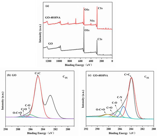 To further illustrate whether 4010NA was grafted to GO, an XPS test was performed as shown in Figure 5. From Figure 5b, for GO, two peaks are detected at 284.8 eV (C1s) and 534.6 eV (O1s). For GO-4010NA from Figure 5c, in addition to strong signals of C1s and O1s, N1s signals were also found at 398.2 eV, indicating that 4010NA molecules were linked to the GO layer. All the above results indicate that the small molecule 4010NA was successfully grafted onto GO.