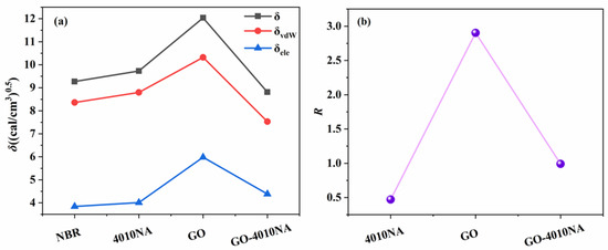 (a) Solubility parameter of NBR, 4010NA, GO, and GO-4010NA. (b) R value of NBR, 4010NA, GO, and GO-4010NA.