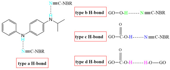 Table 4 shows the atomic charges on the polar functional groups of NBR, 4010NA, and GO molecules obtained by MD simulation. The stronger the electronegativity, the stronger the H-bond is expected to form. According to the atomic charge distribution, it can be predicted that four types of H-bonds may be formed in the NBR composites as shown in Figure 10. The type a H-bond may be between the -CN groups of NBR molecular chains and the -NH- groups of small molecules 4010NA, expressed as (4010NA)-NH…NC-(NBR). The type b H-bond may be between -CN groups of NBR molecular chains and -OH of GO, expressed as (GO)-OH…NC-(NBR). The type c H-bond may be between -CN groups of NBR molecular chains and -COOH groups of GO, expressed as (GO)-COOH…NC-(NBR). The type d H-bond may be between -OH groups of GO and -C-O-C- groups of GO, expressed as (GO)-O…HO-(GO). The specific types and numbers of H-bonds need to be further calculated.
