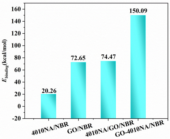 The Ebinding of different NBR composites is shown in Figure 11. Compared with 4010NA/NBR, the addition of GO obviously increases the Ebinding of NBR composites, indicating a stronger interaction between GO and NBR and corresponding to the above H-bonds analysis. In particular, GO-4010NA/NBR composite has the largest binding energy, which is caused by the strong H-bonds of the composites, indicating the better damping performance of the composites.