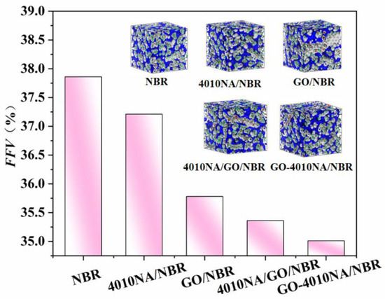 The FFV of different NBR composites is shown in Figure 12. Compared with pure NBR, the FFV of 4010NA/NBR composite decreases. This is due to the formation of H-bonds, which restricts the free movement of NBR molecular chains. This is consistent with the previous analysis of H-bonds above. When GO is added into NBR, the FFV becomes smaller, mainly because a large number of hydrogen bonds are generated between GO and NBR, which makes the NBR molecular chain pile closer and the FFV decreases.