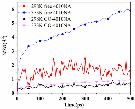 The movement of antioxidant 4010NA and GO-4010NA in 4010NA/NBR and GO-4010NA/NBR composites is simulated and analyzed at 298 K and 373 K, respectively. MSD curves of free and grafted 4010NA molecules are shown in Figure 13. The results show that MSD of both free 4010NA and grafted 4010NA increase with the increase of temperature, indicating that 4010NA was more mobile and migrated easily from the rubber matrix at a high temperature. At the same temperature, the MSD of free 4010NA is higher than that of GO-4010NA, indicating that the GO grafted 4010NA restricts the movement of 4010NA. The grafting method was effective to inhibit the migration of 4010NA.