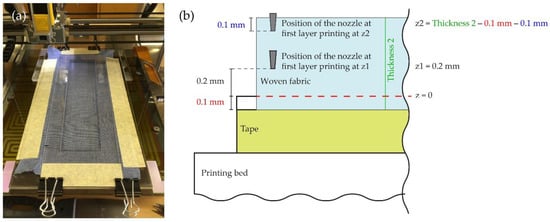 As mentioned in the Introduction and investigated in our preliminary tests, the distance between a printing nozzle and the fabric plays a very important role in the adhesion of 3D printed fabrics. We defined the exact zero position z = 0 with the measurement gap filler of 0.1 mm (Insize feeler gage with the range 0.02−1.0 mm, Insize CO., LTD, Suzhou New District, Suzhou, China). From the zero position, we determined the height of the print nozzle in two ways: the constant z-distance (z1) measured from z = 0 regardless of the thickness of the fabric, and the constant z-distance offset (z2) with respect to the fabric’s thickness (Figure 1b).