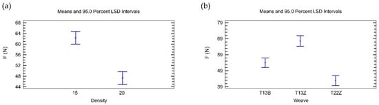 Designs of experiments (DOEs) for simple and double fabrics with predefined distinct factors in Statgraphics Centurion XV software (Statgraphics Technologies, Inc., The Plains, VA, USA) were created. For the simple and double woven fabrics, we specified two factors (weave structure and preset weft density on the loom) that affect the result—in our case, the adhesion force (Table 4). For each combination, we performed three repetitions.