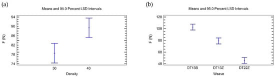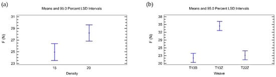 The interaction between weave and density (Table 6) is also statistically significant, but it is the least important, as indicated by the lowest F-ratio. This was expected, since both factors are statistically significant and influence the adhesion of 3D printed simple fabrics at a constant z-distance (z1).