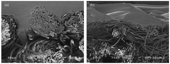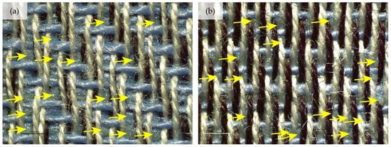 Figure 10 shows a cross-section of the double fabric DT13B 40 (a) along the warp at a magnification of 200× and (b) along the weft at a magnification of 100×. Image (a) shows how the polymer surrounds the weft yarn (PES) and how it penetrates into the yarn and surrounds the individual fibers. Image (b) shows how the polymer surrounds the warp yarn (cotton).