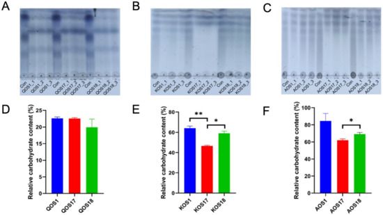 Fermentation and utilization of QOS, KOS, and AOS by three different enterotypes of human microbiota. F1 was identified to be an Escherichia enterotype microbiota, F17 was identified to be a Bacteroides enterotype microbiota, and F18 was identified to be a Prevotella enterotype microbiota. QOS1 denotes fermentation of QOS by gut microbiota F1. QOS17 denotes fermentation of QOS by gut microbiota F17. QOS18 denotes fermentation of QOS by gut microbiota F18. Each fermentation group has three replicates. KOS and AOS were labeled using the same format. TLC analysis of the oligosaccharides before and after fermentation (A–C). Con is the control medium at the beginning of fermentation. Utilization of the oligosaccharides during fermentation (D–F). All the fermentation experiments were performed in triplicates. Data are expressed as mean ± SEM. Statistical analysis was performed using ANOVA with post hoc Tukey’s multiple comparisons test. * p < 0.05, ** p < 0.01.
