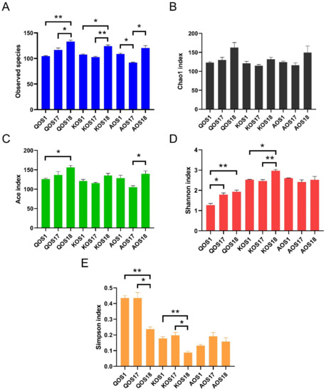 The α−diversity analysis of the gut microbiota. Observed species (A), Chao1 index (B), Ace index (C), Shannon index (D), and Simpson index (E). QOS1 denotes fermentation of QOS by gut microbiota F1. QOS17 denotes fermentation of QOS by gut microbiota F17. QOS18 denotes fermentation of QOS by gut microbiota F18. Each fermentation group has three replicates. KOS and AOS were labeled using the same format. Data are expressed as mean ± SEM. Statistical analysis was performed using ANOVA with post hoc Tukey’s multiple comparisons test. * p < 0.05, ** p < 0.01.