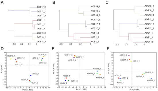 The β−diversity analysis of the gut microbiota. Clustering analysis of the gut microbiota (A–C). PCA score plot analysis of the gut microbiota (D–F). QOS1 denotes fermentation of QOS by gut microbiota F1. QOS17 denotes fermentation of QOS by gut microbiota F17. QOS18 denotes fermentation of QOS by gut microbiota F18. Each fermentation group has three replicates. KOS and AOS were labeled using the same format.
