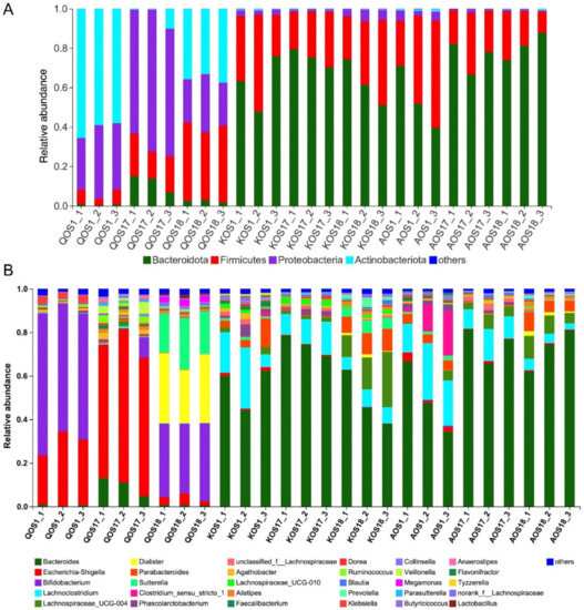 Compositional analysis of the gut microbiota. Microbiota composition at the phylum level (A) and genus level (B). QOS1 denotes fermentation of QOS by gut microbiota F1. QOS17 denotes fermentation of QOS by gut microbiota F17. QOS18 denotes fermentation of QOS by gut microbiota F18. Each fermentation group has three replicates. KOS and AOS were labeled using the same format.