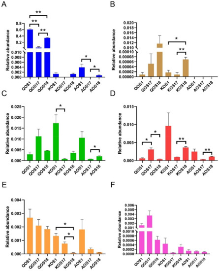 Comparison of the prebiotic effects of QOS, KOS, and AOS on the human gut microbiota. Relative abundances of Bifidobacterium spp. (A), Lactobacillus spp. (B), Faecalibacterium spp. (C), Butyricicoccus spp. (D), Roseburia spp. (E), and Eubacterium hallii (F). QOS1 denotes fermentation of QOS by gut microbiota F1. QOS17 denotes fermentation of QOS by gut microbiota F17. QOS18 denotes fermentation of QOS by gut microbiota F18. Each fermentation group has three replicates. KOS and AOS were labeled using the same format. Data are expressed as mean ± SEM. Statistical analysis was performed using ANOVA with post hoc Tukey’s multiple comparisons test. * p < 0.05, ** p < 0.01.