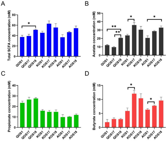 Production of short-chain fatty acid (SCFA) by three different enterotypes of human microbiota during fermentation of QOS, KOS, and AOS. The concentrations of total SCFA (A), acetate (B), propionate (C), and butyrate (D) were analyzed. QOS1 denotes fermentation of QOS by gut microbiota F1. QOS17 denotes fermentation of QOS by gut microbiota F17. QOS18 denotes fermentation of QOS by gut microbiota F18. Each fermentation group has three replicates. KOS and AOS were labeled using the same format. Data are expressed as mean ± SEM. Statistical analysis was performed using ANOVA with post hoc Tukey’s multiple comparisons test. * p < 0.05, ** p < 0.01.