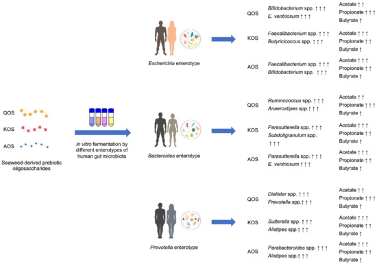 Previous studies have indicated that marine algae oligosaccharides, including QOS, KOS, and AOS, could promote the growth of beneficial microbes in the gut [9,11]. In the present study, we found that the effects of marine algae oligosaccharides on the gut microbiota are enterotype specific. In this light, we then wondered if enterotype could also affect the prebiotic effect of marine algae oligosaccharides.