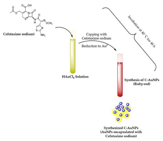 Gold nanoparticles (AuNPs) were synthesized by incubating 1 mM aqueous gold salt solution (H[AuCl4]) in phosphate buffer (pH = 7.4) and CTX (50 µg/mL) in a 3 mL reaction mixture. The reaction mixture was then incubated at 40 °C for 48 h. As a control, a reaction mixture containing just antibiotic (CTX) was utilized. Following a 48-h incubation period, the solution color changes to ruby red, demonstrating that the reaction has been completed. The generated cefotaxime-loaded gold nanoparticles (C-AuNPs) were then recovered by centrifugation (30,000× g) for 30 min. To remove unbound CTX, C-AuNPs were rinsed using 50% v/v ethanol and washed two times with Milli Q water.