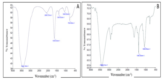 FTIR spectroscopy was conducted to confirm the efficient loading of CTX onto the surface of AuNPs. The FTIR spectrum obtained from C-AuNPs was compared to that of pure CTX. The FTIR spectrum of pure CTX (Figure 5A) shows a characteristic absorption band at 3422.18 cm−1, corresponding to N–H and O–H groups (stretching vibrations). The additional peak at 1638 cm−1 represents amide N–H bending. The absorption band at 1638 cm−1 are designated for the C=C stretching and C=N stretching. The absorption band at 1060 cm−1 corresponds to C–O–C symmetric stretching. Of note, the obtained FTIR spectrum of C-AuNPs (Figure 5B) portrayed a significant reduction in N–H, C=N, C=C and C–O–C bands (Figure 5B), compared to the spectrum of pure CTX. These results might suggest the efficient capping/loading of CTX over AuNPs.