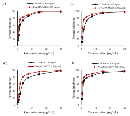 Minimum inhibitory concentration (MIC) of CTX and C-AuNPs against (A) Escherichia coli; (B) Klebsiella oxytoca; (C) Pseudomonas aeruginosa. (D) Staphylococcus aureus. The data represent the means ± standard errors of three independent experiments.