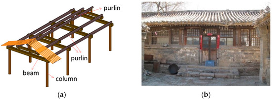 - Xue, J.; Xu, D.; Ren, G.; Guo, R. Shake table test on seismic performance of column and tie wooden structure in traditional residence. Chin. Civ. Eng. J. 2019, 52, 5–14. (In Chinese) [Google Scholar] [CrossRef]