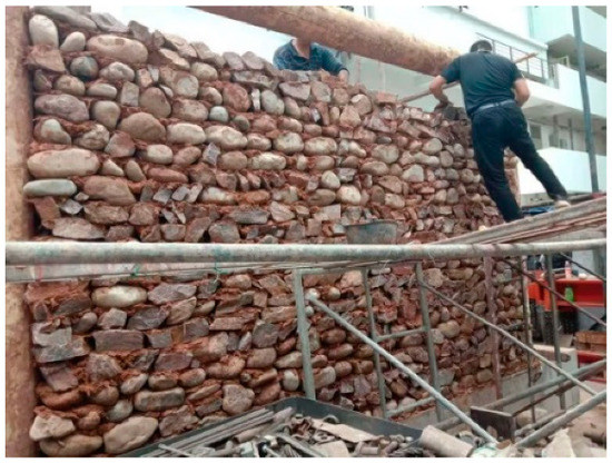 | W1 | Strengthened by PP band mesh (250 mm × 250 mm) and plastering mortar | Pebbles and irregular stones infilled with mud |