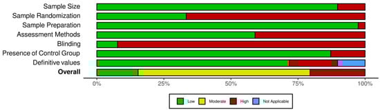 Most of the included studies showed a moderate risk of bias overall (Table 1). Only six studies out of the thirty-nine included studies were judged to have a low risk of bias [27,28,29,30,31,32] (Table 2). Randomization and blinding were not reported in most of the included studies, leading to a positive risk of bias (Figure 2). Almost all of the included studies reported the sample size per group and the sample preparation details.