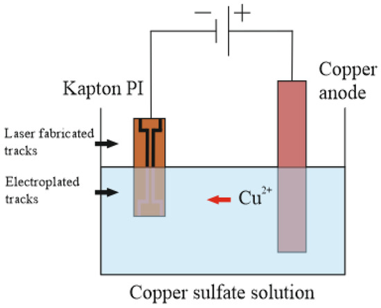 The metal deposition was performed using galvanic plating. Laser-treated Kapton PI film was connected to the cathode terminal for copper deposition, and a copper rod (Cu) was connected to the anode terminal. Electroplating was performed in the electrolytic solution, which consisted of sulfuric acid (H2SO4) 50 g/L, copper sulphate (CuSO4) 200 g/L, and deionized water (H2O). Plating speed at a current density of 10 mA/cm2 was 0.22 µm/min (Figure 2).