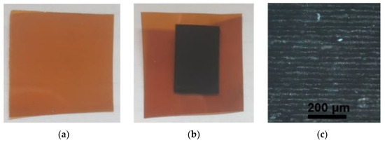 Polymer Kapton PI film: (a) before laser treatment, (b) after laser treatment and (c) magnified (×10) view of the laser-treated area.