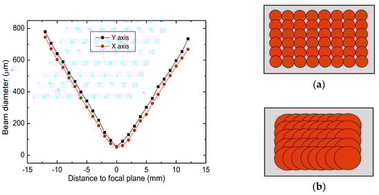 Beam diameter out of focus. At the focal plane, almost non-overlapping spots were obtained (a). Increasing defocusing, overlap increased due to significantly larger beam diameter (b).
