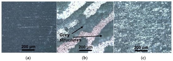 Microscope images of the sample surface: (a) treated at the focal plane. Soot appeared on the surface of the sample; (b) treated 4 mm below the focal plane, where clusters of gray-colored structures formed; (c) treated 7 mm below the focal plane. LIG structures, with smooth surface and low sheet resistance, were formed in this regime.