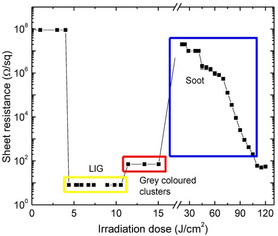 The sheet resistance of laser-treated polyimide surface versus irradiation dose. Irradiation dose was varied only by changing beam diameter on the sample surface. Three different polyimide surface modification regimes were distinguished. Depending on the applied irradiation, dose, soot, graphene (as we suggest LIG) or transitional state were found on the PI surface.