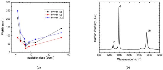 Dependence of FWHM of D, G and 2D bands on the irradiation dose (a); Raman spectra of LIG in PI achieved using the 7.34 J/cm2 irradiation dose (b).