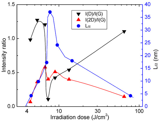 The LIG crystallite size was evaluated at various irradiation doses using this equation. The dependence is plotted in Figure 9. The apparent maximum crystallite size was 37 nm when a 7.34 J/cm2 irradiation dose was applied. This dose value coincides with the narrowest FWHMs for spectral bands D, G and 2D (Figure 8a). At this dose, the minimum of I(D)/I(G) = 0.1. On the other hand, the maximum value of I(2D)/I(G) = 0.58 ratio was reached at a lower irradiation dose of 6.72 J/cm2.