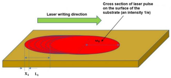 The schematic illustration of laser beam translation, used for thermal modelling. Here, X1 is the subsequent pulse translation distance, L1 is a distance of translation equal to ω0.