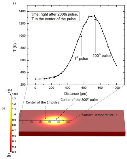 The time interval between pulses was 10 µs. The temperature distribution right after the 200th pulse (where the beam was translated by L1 equal to ω0) is presented in Figure 11.
