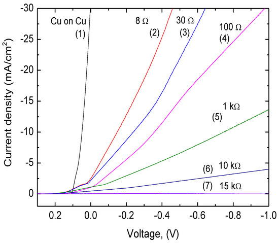 The Cu deposition on laser-treated Kapton PI films was performed using galvanic plating in an acidic copper bath (Figure 2). Plating was performed on a 10 × 20 mm rectangle laser-treated area. The applied current density was the main parameter for the electroplating. The optimized plating current and electrolysis conditions on different types of surface treatment were determined from the voltammogram of Cu deposition on laser-treated polyimide (Figure 12). The current density that could be applied for plating depended on the sheet resistance of the treated surface. An increase in the treated-surface sheet resistance resulted in a decrease in cathode current that could be applied. When sheet resistance increases, the Cu electrodeposition curve shifts to the negative side (Figure 12). The negative shift increases the overpotential of the Cu electrodeposition at a constant current density. For example, during the plating on LIG structure (8 Ω/square, curve 2, Figure 12), the current density of 10 mA/cm2 was at a low voltage of −0.17 V, in contrast, plating on the surface with a sheet resistance of 100 Ω/square (curve 4, Figure 12) was achieved when voltage was −0.34 V. During the plating on higher sheet resistances than 100 Ω/square (curves 5–7, Figure 12), a significant decrease in plating current was observed. Selective copper deposition on the laser-treated surface was possible when the treated surface sheet resistance was 10 kΩ/square or lower. The best plating results were achieved when plating on LIG (curve 2, Figure 12). It was most similar to copper-on-copper plating (curve 1, Figure 12).