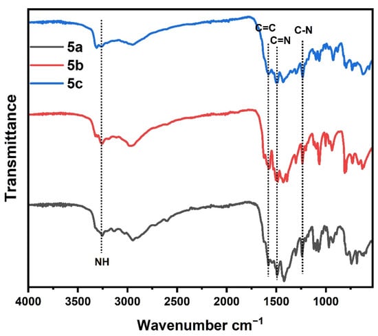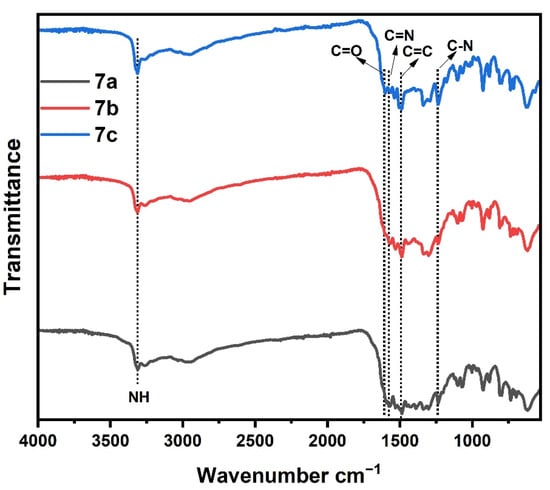 The FT-IR spectrum (Figure 1) for polymers 5a–c showed absorption peaks related to N-H bond in the range 3320 to 3350 cm−1. The C-H; sp3 and sp2 hydrogen have a characteristic peak in the range 2840–2950 cm−1. The peaks related to C=N bond of triazine ring observed at 1590 and 1550 cm−1. The peaks C=C of phenyl ring were observed at 1600, and 1490 cm−1 and the peak at 1270 cm−1 was related to the C–N bond of the triazine ring. In addition, the peaks at 757 and 688 cm−1 were attributed to the monosubstituted phenyl ring (Table 1). While FT-IR spectra (Figure 2) for polymers 7a–c showed, absorption peaks related to the N–H bond. C–H in the range 3320 to 3330 cm−1; sp3 and sp2 hydrogen has a characteristic peak in the range 2830–2950 cm−1. The peaks at 1590 and 1550 cm−1 were ascribed to the C=N of the triazine ring. The both peaks at 1630–1620 and 1490–1470 cm−1 were ascribed to C=O of the hydrazide group and C=C of the phenyl ring, respectively. The peak at 1270 cm−1 was assigned to the C–N bond of the triazine ring (Table 1). The shift in C=N and C–N values was due to the influence of the replacement groups on the aniline ring bonded to the triazine ring. In addition, the elemental analysis for the prepared 5a–c and 7a–c samples agreed with the calculated values as shown in Table 2.